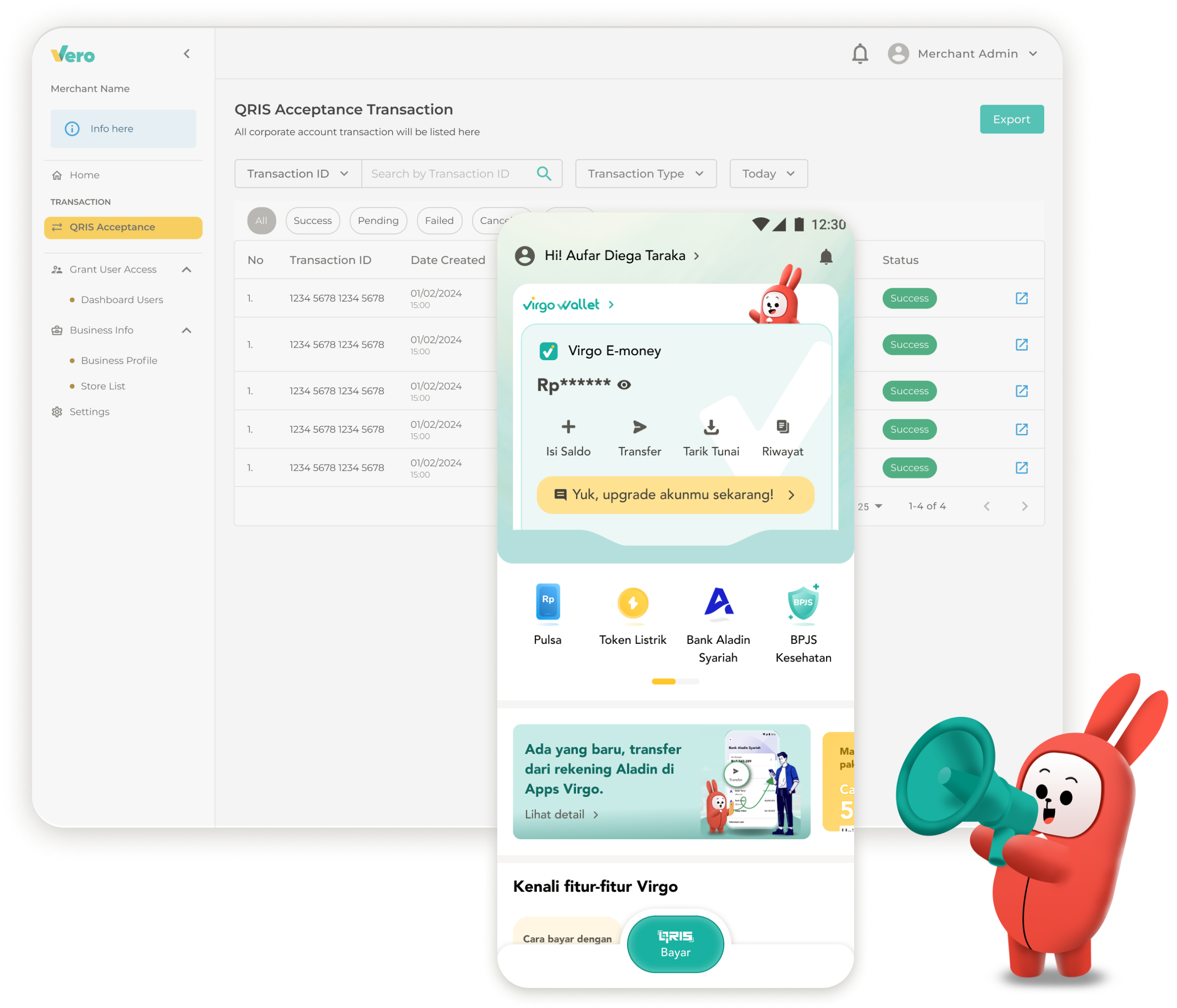 Sematkan Virgo Wallet di aplikasi layananmu dan integrasikan platform usahamu dengan layanan pembayaran Virgo melalui API Virgo yang handal, berizin resmi SNAP ASPI, dan mudah digunakan.