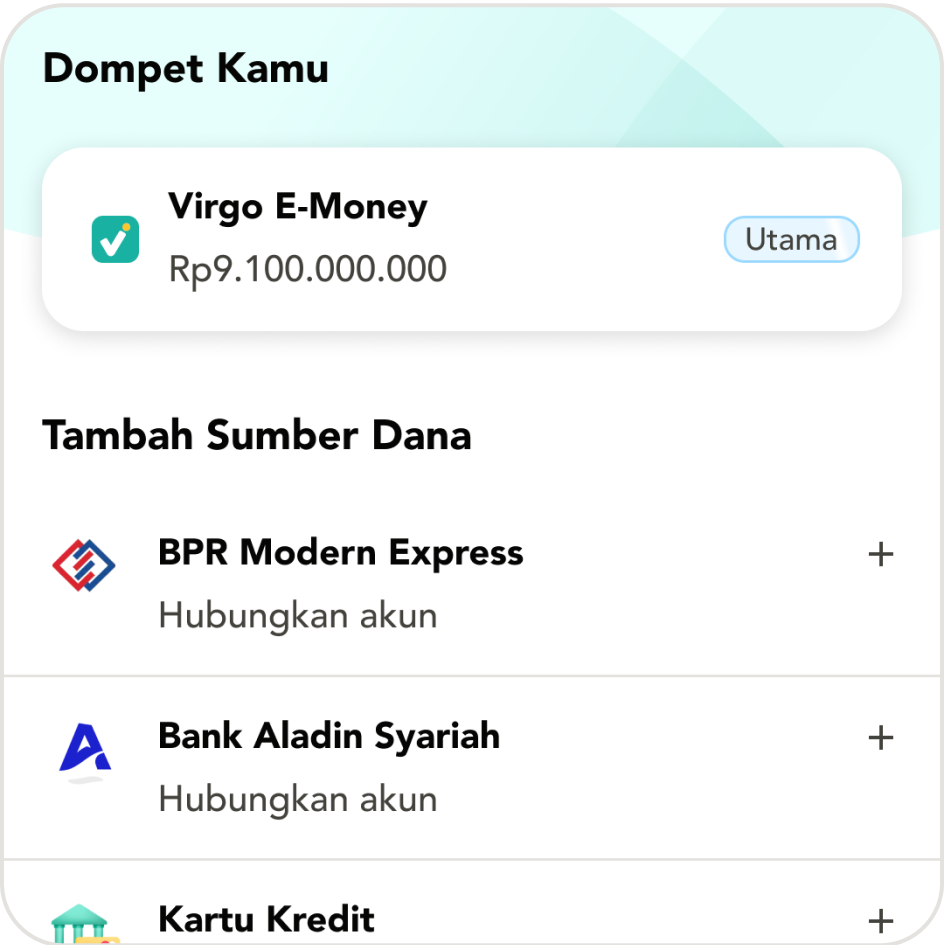 Layanan dompet digital Virgo akan mendukung sumber dana lain, dimana layanan pembayaran Anda dapat menggunakan fitur keuangan yang ada di dalam platform Virgo.
